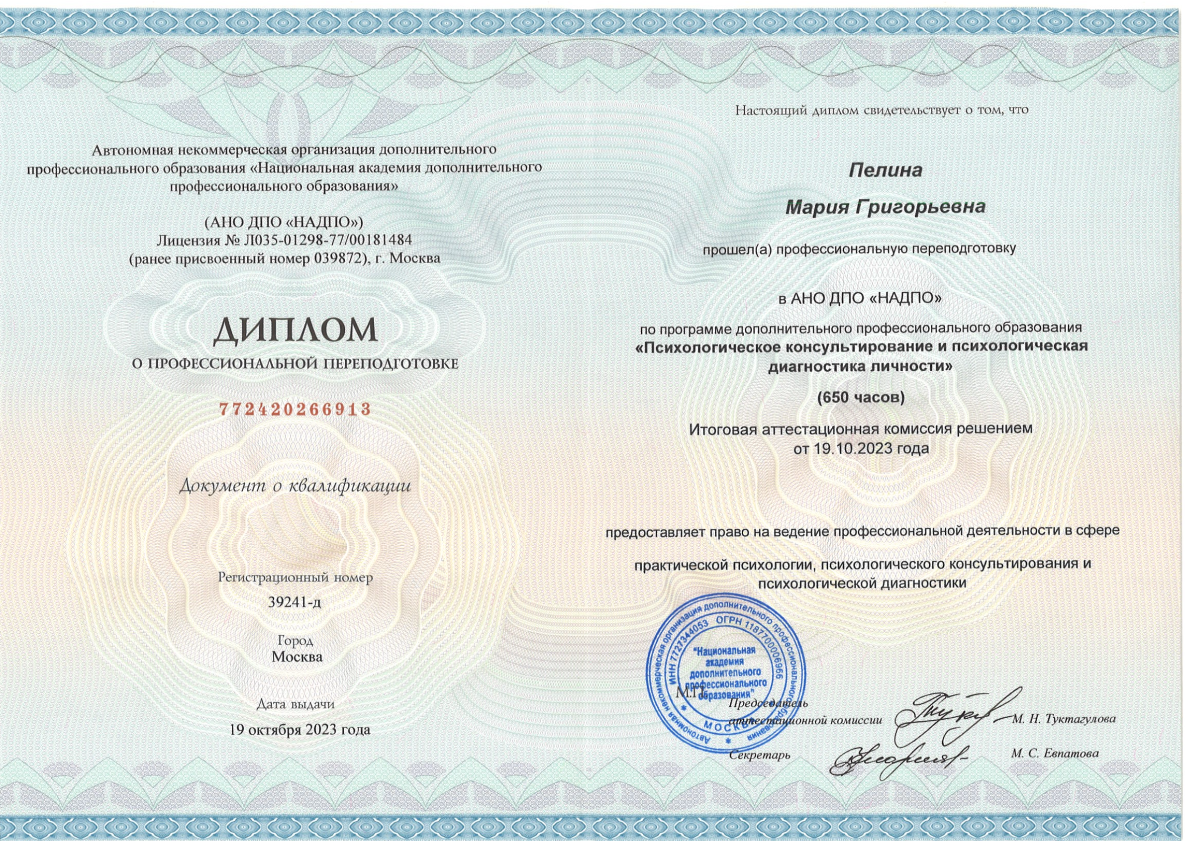 "Психологическое консультирование и психологическая диагностика личности"